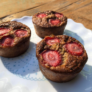 Ik bakte hele simpele suikervrije cakejes met heerlijke Manderveense aardbeien er bovenop; nog geen 10 minuutjes om te maken en maar 25 minuten in de oven..